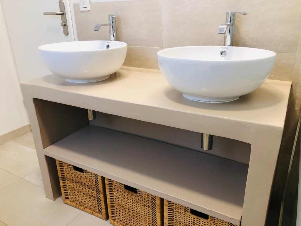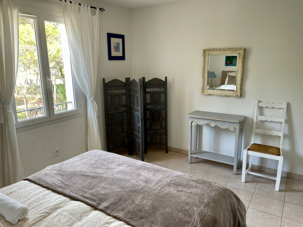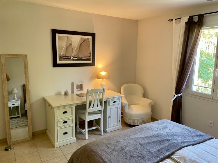La villa dispose de 3 chambres au 1er étage : 2 avec lits doubles 160 cm + une chambre avec 2 lits simples de 90 cm. Les 3 chambres sont climatisées en « gainable » (sans souffle).