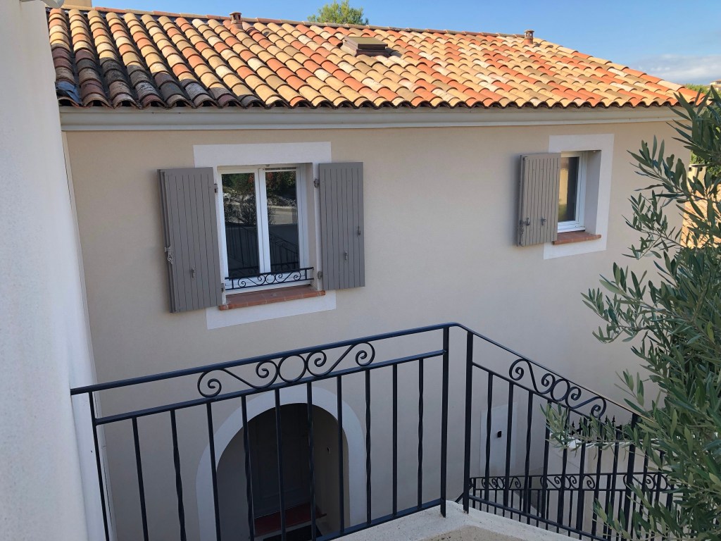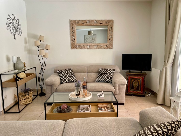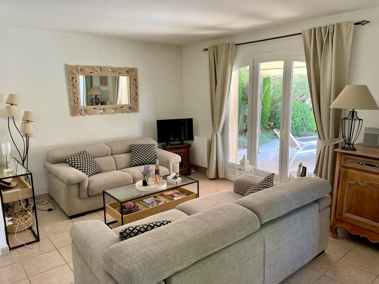 Le rez de chaussée comprend une salle de séjour avec TV, salle a manger donnant sur la terrasse et la piscine, une cuisine ouverte toute equipée, et les WC.