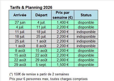 Nous proposons des locations à la semaine, en principe du samedi au samedi en haute saison, avec davantage de flexibilité en dehors de la haute saison.